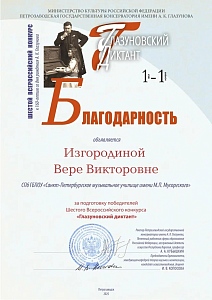 Поздравляем наших уважаемых преподавателей с победами их замечательных учащихся на Шестом Всероссийском конкурсе «Глазуновский диктант», который включен в Перечень олимпиад и творческих конкурсов, утвержденный Министерством просвещения Российской Федерации!