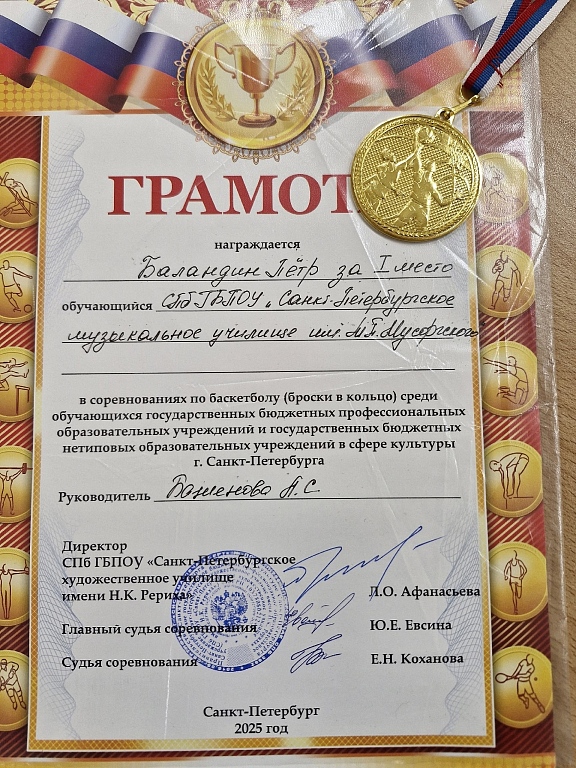 Поздравляем студента I курса отдела духовых инструментов Петра Баландина с абсолютной победой среди юношей: 9 из 10 бросков в корзине!