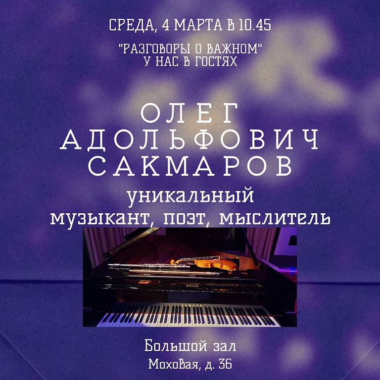 Приглашаем студентов музыкального училища Мусоргского на творческую встречу с легендарным Олегом Адольфовичем Сакмаровым - уникальным музыкантом и поэтом, флейтистом культовых рок-групп «Аквариум» и «Наутилус Помпилиус»!
